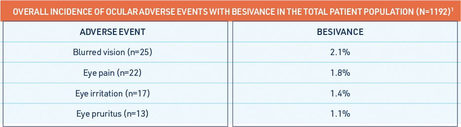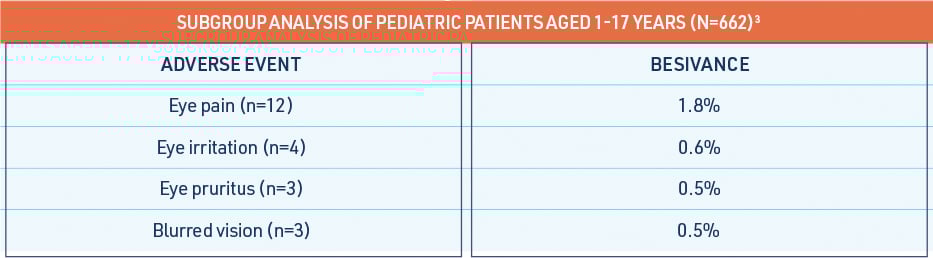 References: 1. Mah FS, Sanfilippo CM. Besifloxacin: Efficacy and safety in treatment and prevention of ocular bacterial infections. Ophthalmol Ther. 2016;5(1):1-20. 2. BESIVANCE [package insert]. Bridgewater, NJ: Bausch & Lomb Incorporated; 2020. 3. Comstock TL, Paterno MR, Usner DW, Pichichero ME. Efficacy and safety of besifloxacin ophthalmic suspension 0.6% in children and adolescents with bacterial conjunctivitis: a post hoc, subgroup analysis of three randomized, double-masked, parallel-group, multicenter clinical trials. Paediatr Drugs. 2010;12(2):105-112.